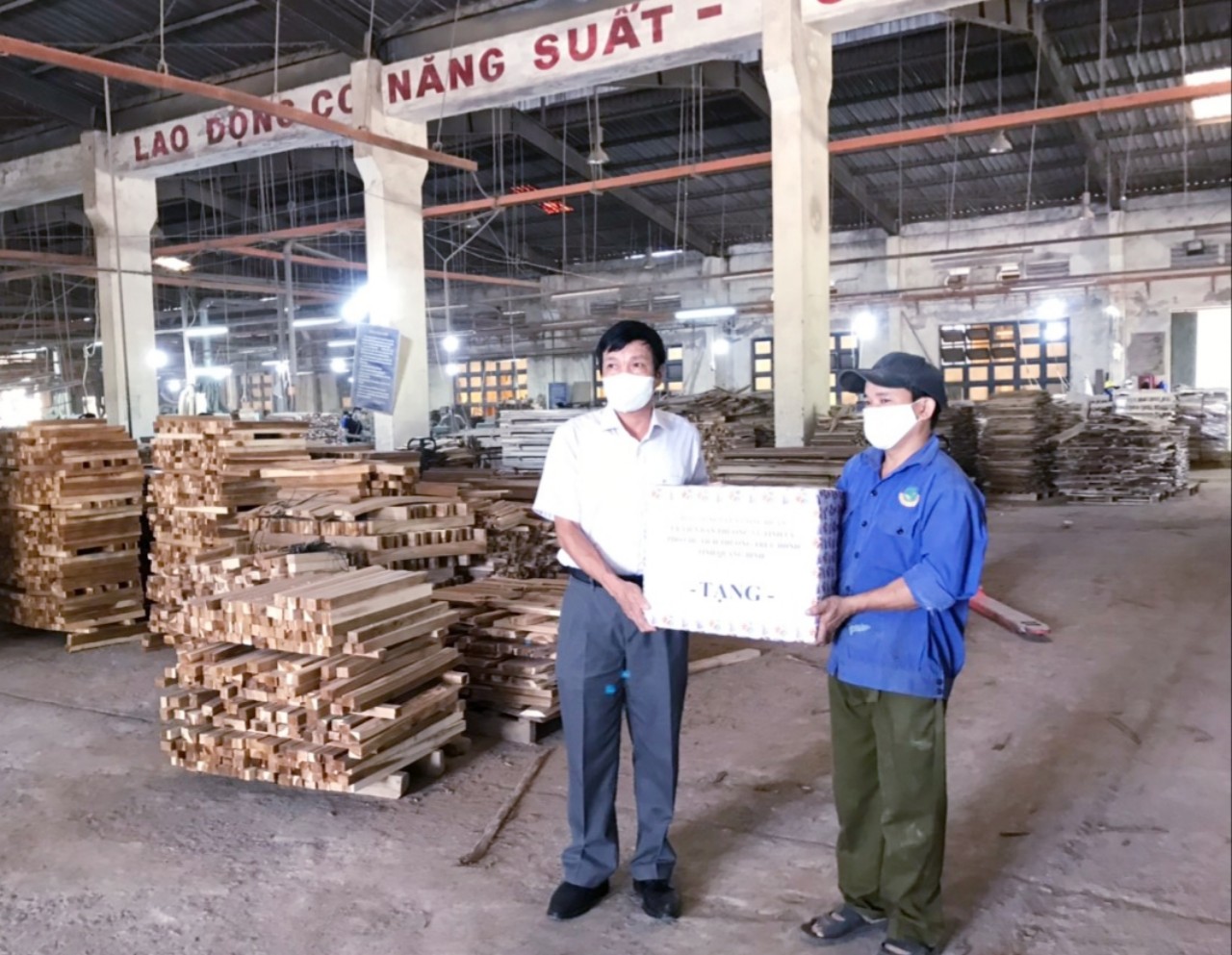 Đồng chí Nguyễn Công Huấn tặng quà cho cán bộ và công nhân Nhà máy chế biến gỗ Phú Quý thuộc Công ty cổ phần Việt Trung