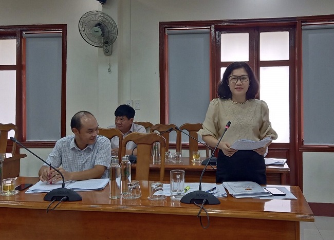 Đồng chí Nguyễn Thị Mai, Chánh Văn phòng Đoàn ĐBQH và HĐND tỉnh báo cáo tại cuộc họp