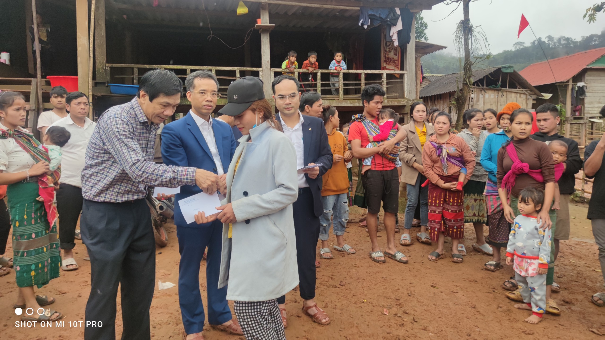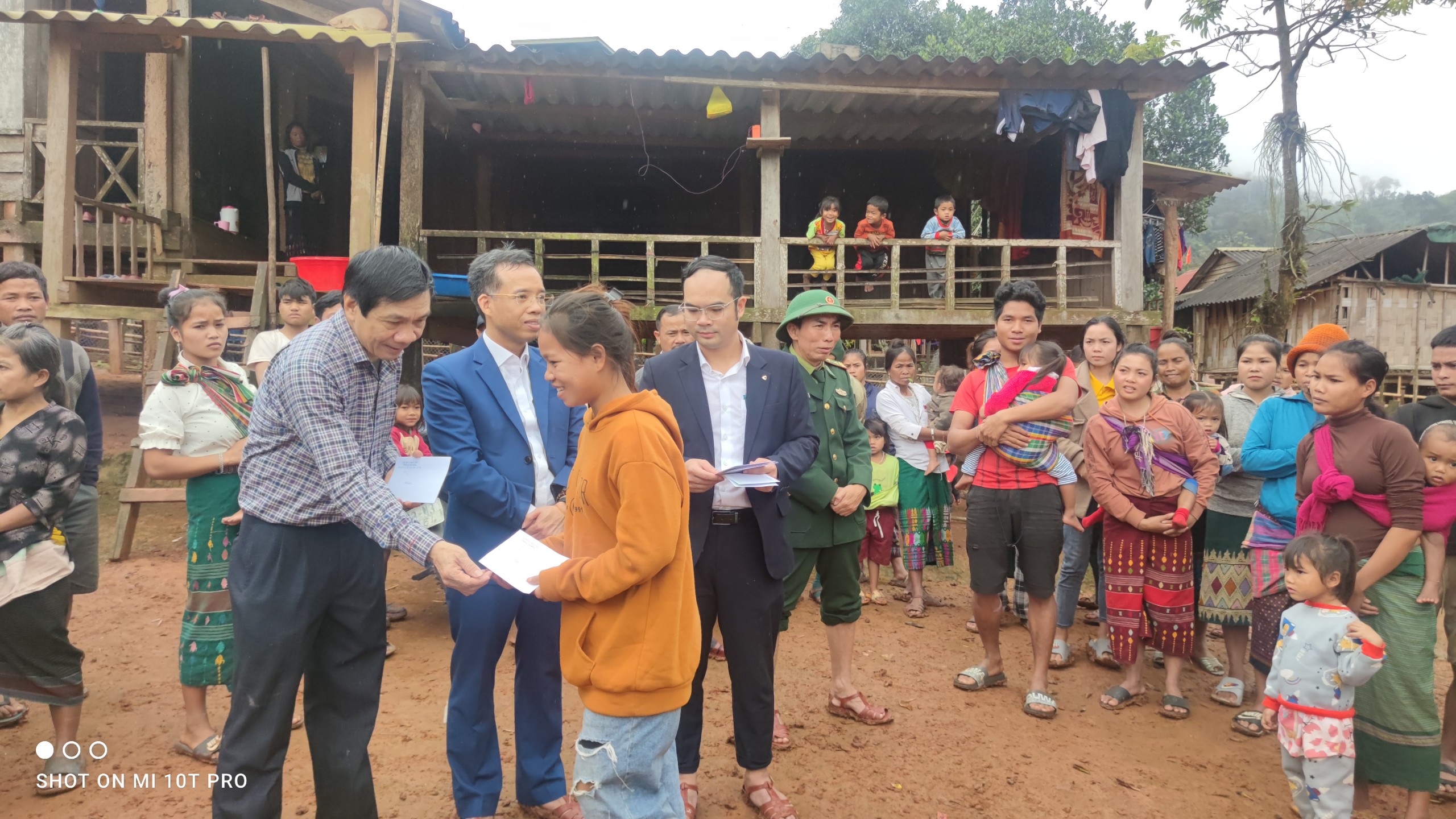 Đồng chí Phó Chủ tịch Thường trực HĐND tỉnh và đại diện nhà tài trợ tặng quà cho bà con bản Coóc