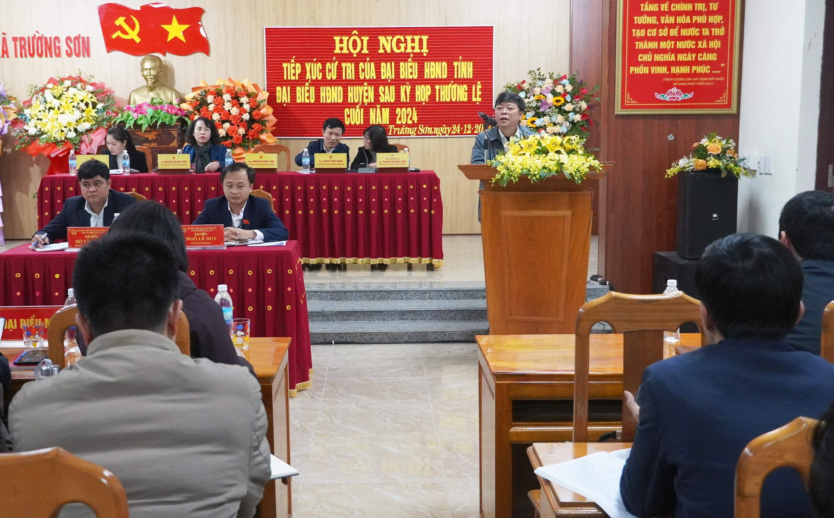 Chiều ngày 24/12/2024, tại xã Trường Sơn, tổ đại biểu HĐND tỉnh gồm các đại biểu: Nguyễn Thị Bích Thủy, Tỉnh ủy viên, Giám đốc Sở Văn hóa và Thể thao; Nguyễn Ngọc Thụ, Phó Bí thư huyện ủy, Chủ tịch UBND huyện Quảng Ninh; Phan Trần Nam, Phó trưởng Ban Văn hóa-Xã hội, HĐND tỉnh và Ngô Thị Nhung, Bác sĩ chuyên khoa cấp I, Phỏ Trưởng khoa Kiểm soát bệnh tật, Trung tâm Y tế huyện Quảng Ninh tiếp xúc cử tri tại huyện Quảng Ninh sau kỳ họp thứ 19 (kỳ họp thường lệ cuối năm 2024).