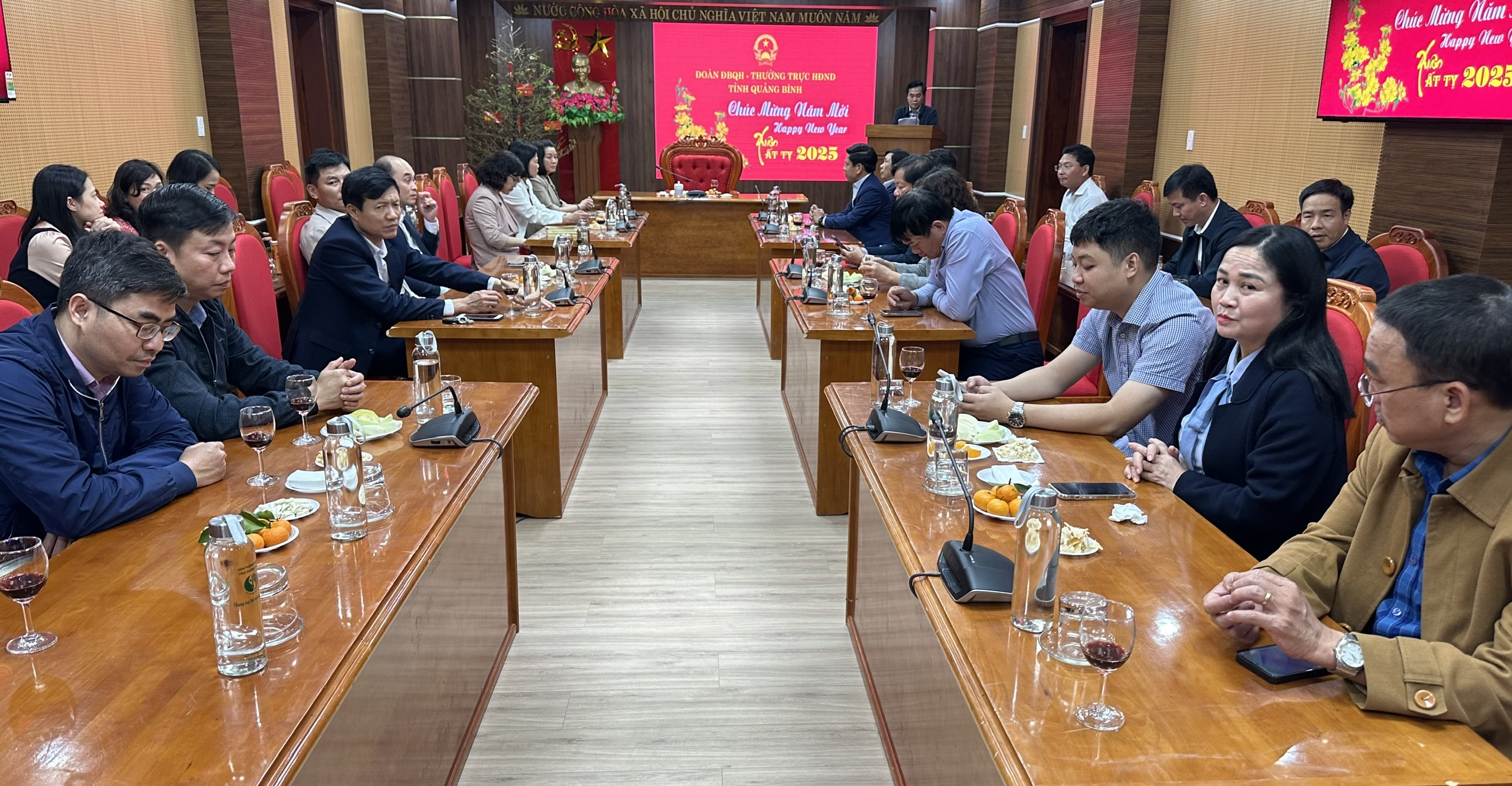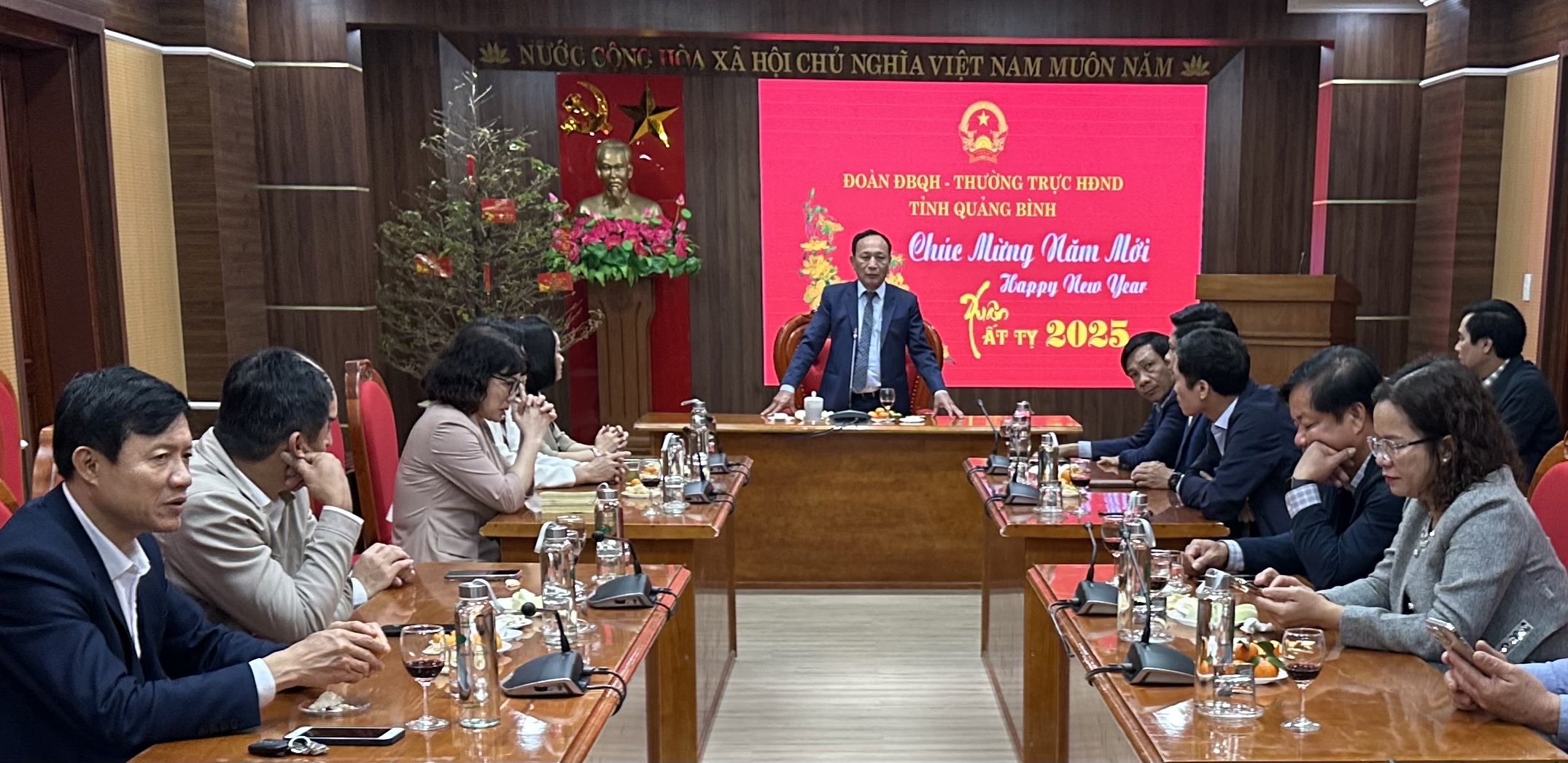 Trong không khí tưng bừng, phấn khởi mừng Đảng, mừng Xuân mới, sáng ngày 3/2/2025 (tức ngày mùng 06 tháng Giêng năm Ất Tỵ) Thường trực HĐND tỉnh và Đoàn ĐBQH tổ chức gặp mặt đầu xuân năm 2025 cán bộ, công chức, người lao động đang làm việc tại cơ quan Đoàn ĐBQH và HĐND tỉnh. Đồng chí Trần Hải Châu, Phó Bí thư Thường trực Tỉnh ủy, Chủ tịch HĐND tỉnh chủ trì buổi gặp mặt.