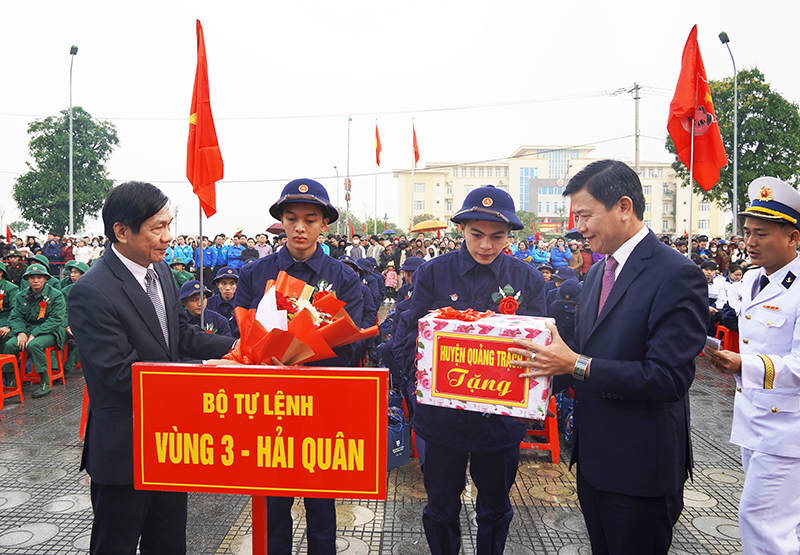 Các đồng chí lãnh đạo tỉnh và huyện Quảng Trạch đã tặng hoa, quà động viên các tân binh lên đường nhập ngũ tiếp tục phát huy truyền thống cách mạng vẻ vang của quê hương, quyết tâm khắc phục khó khăn, ra sức học tập, rèn luyện, nỗ lực phấn đấu hoàn thành tốt mọi nhiệm vụ được giao.