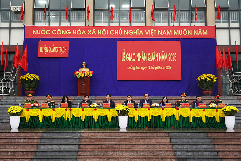 Sáng ngày 14/2/2025, huyện Quảng Trạch long trọng tổ chức lễ giao, nhận quân năm 2025. Dự lễ có các đồng chí: Nguyễn Công Huấn, Ủy viên Ban Thường vụ Tỉnh ủy, Phó Chủ tịch Thường trực HĐND tỉnh; các đồng chí Tỉnh ủy viên: Nguyễn Xuân Đạt, Giám đốc Sở Kế hoạch và Đầu tư; Nguyễn Chí Thắng, Bí thư Huyện ủy Quảng Trạch; đại diện lãnh đạo các sở, ngành, đoàn thể, đơn vị nhận quân và 145 thanh niên nhập ngũ.